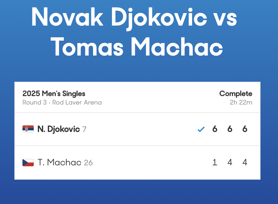 北京时间1月17日,在2025澳网男单第三轮较量中,赛会十届冠军德约科维奇直落三盘,以6比1、6比4、6比4击败26号种子马哈奇,职业生涯第17次晋级澳网16强。